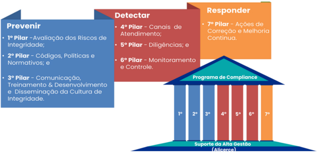 O Programa de Compliance do Sistema FIEPE está estruturado em três grandes processos: Prevenir, Detectar e Responder. E, sustentado por 7 pilares que orientam as ações e fortalecem a cultura de integridade na organização. São eles: